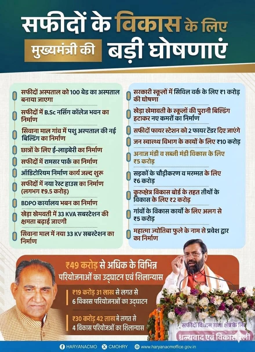 धन्यवाद एवं विकास रैली में सीएम नायाब सैनी ने विधायक रामकुमार गौतम की सभी मांगों पर मोहर लगाई। दिलचस्प बात यह रही कि जब मुख्यमंत्री सफीदों को सौगातें देने की घोषणा कर रहे थे तो उसी समय विधायक रामकुमार गौतम चलकर मुख्यमंत्री के पास आए और उनके भाषण के बीच में मुख्यमंत्री के कान में कुछ कहा और तत्पश्चात मुख्यमंत्री ने तत्काल उसकी बात को मानते हुए सफीदों के सरकारी अस्पताल को 50 से 100 बैंड का करने की घोषणा कर दी। मुख्यमंत्री द्वारा सफीदों को दी जाने वाली मुख्य सौगातें!